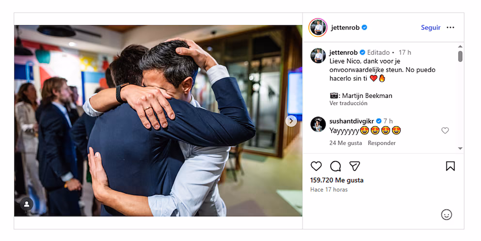 “Querido Nico, gracias por tu apoyo incondicional. No puedo hacerlo sin ti”, le escribió en neerlandés y en español en un posteo específico que subió a su cuenta de Instagram seguida por más de 242 mil personas. Allí eligió dos fotos muy especiales conel deportista de 28 años: una abrazados en medio del búnker de campaña y la otra mientras Rob mira a un Nico emocionado por lo sucedido. “Te amo, señor Jetten”, le contestó él en los posteos. “Casémonos”, le devolvió el político.